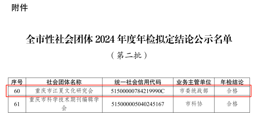 近日,重庆市民政局完成了全市性社会团体2024 年度年检工作。根据《社会团体登记管理条例》规定,经严格审核,重庆市江夏文化研究会年检结论为合格。