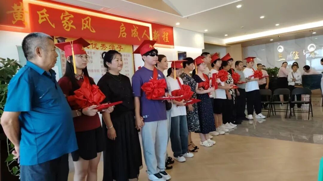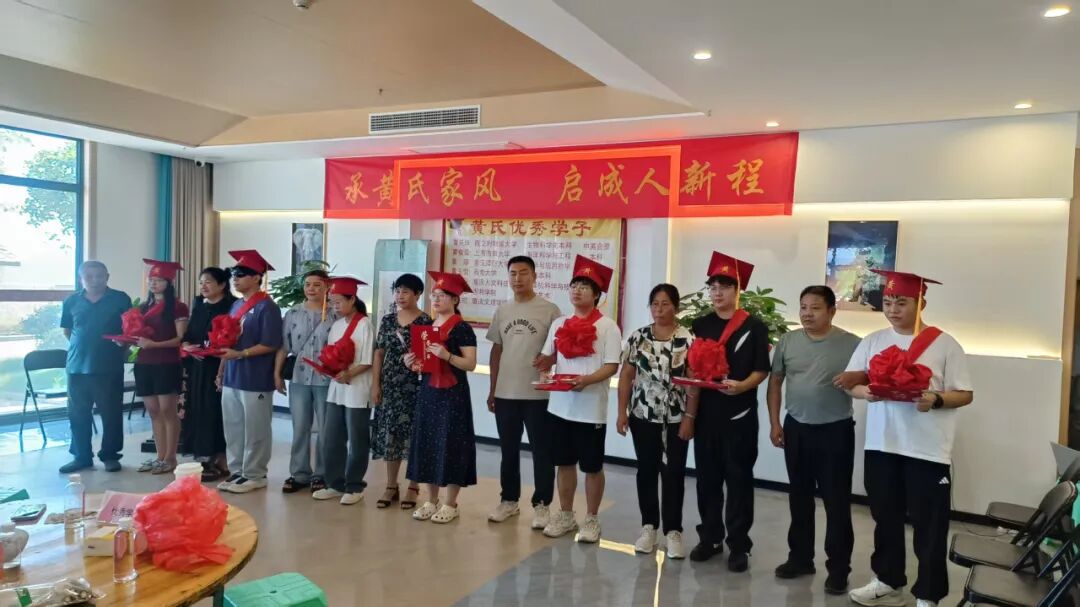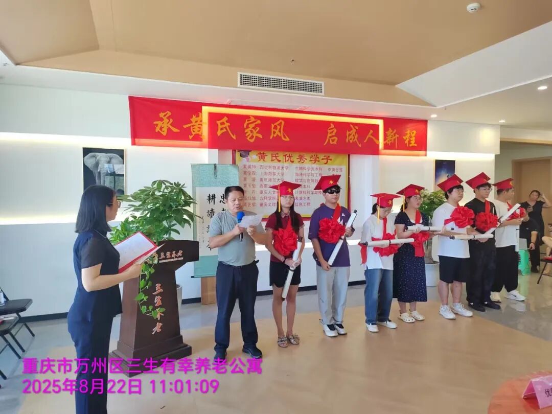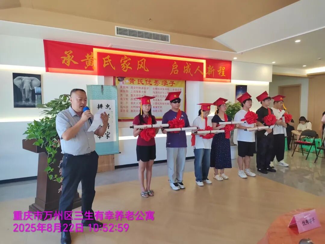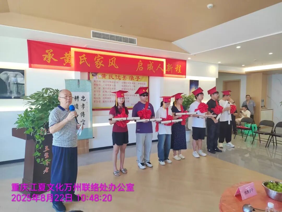 伴随激昂的《自豪,重庆黄》乐曲,仪式正式拉开帷幕。七位考取本科院校的黄氏子弟依次登台,接受市会副监事长、万州联络处主任黄国庆,常务副主任兼秘书长黄华,副主任黄维祥、黄琴、黄国安,姚老师以及监事长黄佐琼的现场授礼——不仅获颁荣誉证书、佩戴大红绶带与成人礼帽,还收到了寓意美好的“金榜题名”红包。