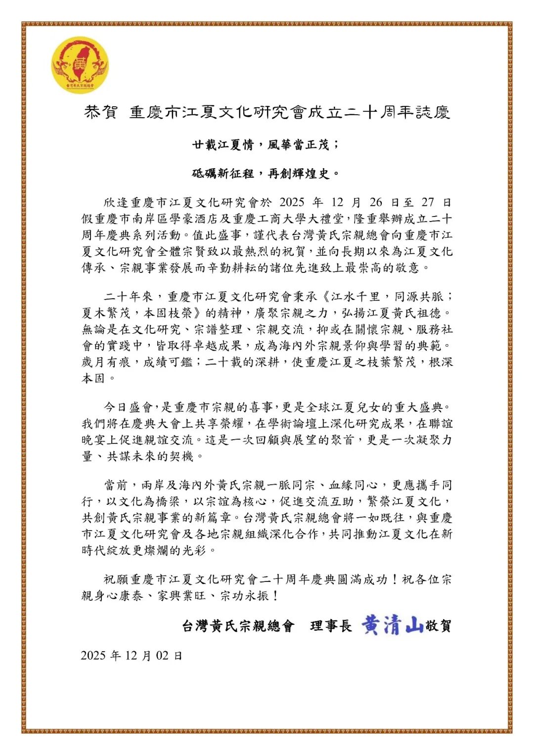 来自全国友好单位的祝贺信-重庆市江夏文化研究会二十周年庆典