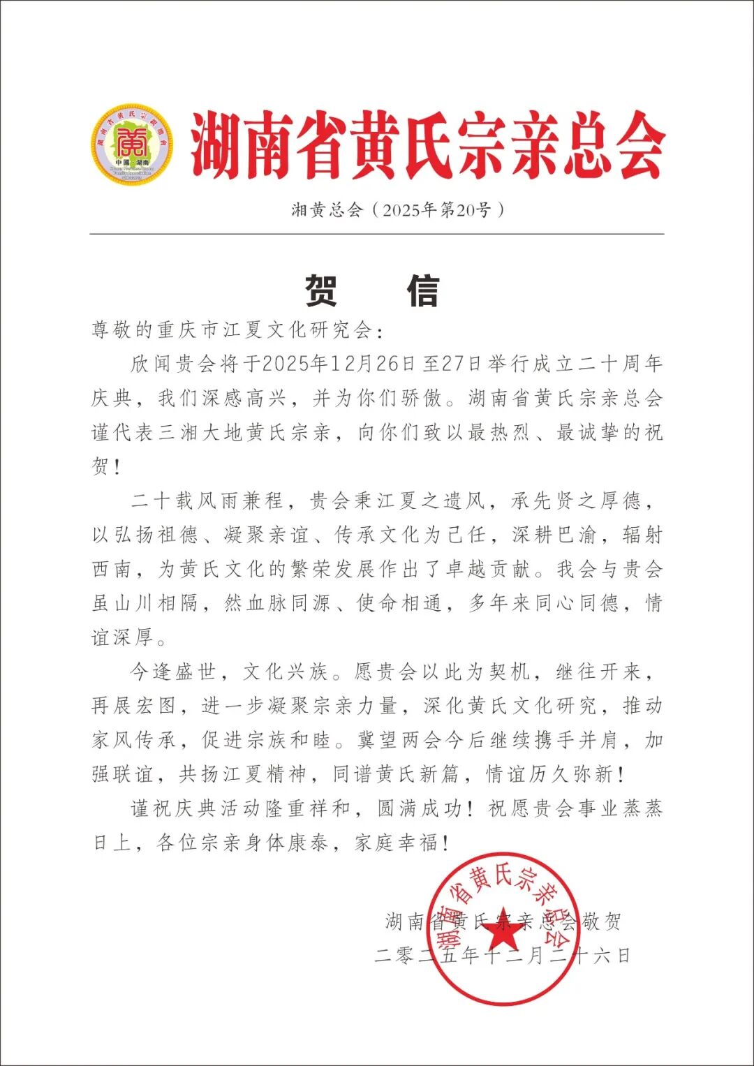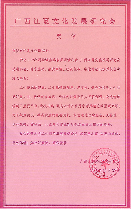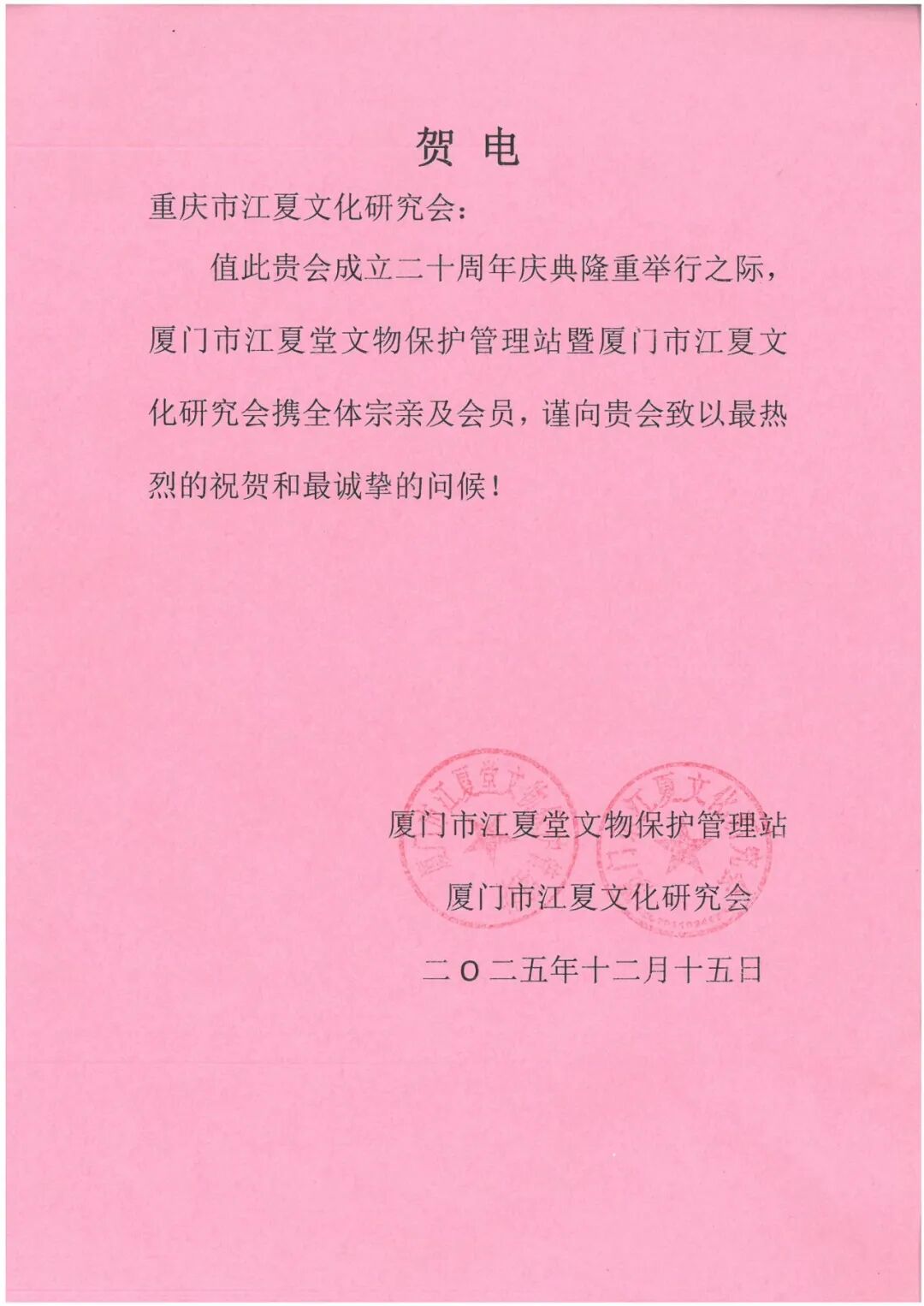来自全国友好单位的祝贺信-重庆市江夏文化研究会二十周年庆典